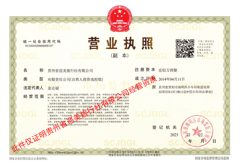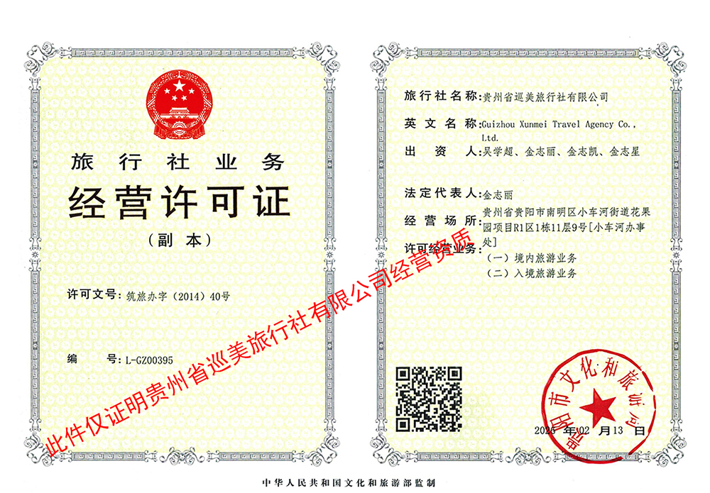 贵州省巡美旅行社有限公司(原名:贵州遨鹰旅行社有限公司 时段:2020年3月16日至2024年5月15日;原名:贵州万美优旅行社有限公司 时段:2014年04月11日至2020年03月16日)(统一社会信用代码/营业执照编号:91520102096868831P 旅行社业务经营许可证号:L-GZ00395 英文名称:Guizhou Xunmei Travel Agency Co., Ltd.)。我社是由贵州省旅游局、贵阳市旅游局批准成立,经贵州省贵阳市南明区工商行政管理局登记注册,并足额缴纳质量保证金的一家具有独立法人资质的旅游企业。经营范围包括:旅游业务;组织文化艺术交流活动;休闲观光活动;组织体育表演活动;健身休闲活动;旅游开发项目策划咨询;农村民间工艺及制品、休闲农业和乡村旅游资源的开发经营;会议及展览服务;酒店管理;餐饮管理;道路旅客运输经营;名胜风景区管理;游览景区管理;城市公园管理;摄影扩印服务;广告设计、代理;广告制作;广告发布;平面设计;旅客票务代理;票务代理服务;品牌管理;服装服饰零售;鞋帽零售;户外用品销售;日用品销售;食品销售(仅销售预包装食品);农副产品销售;烟草制品零售;酒类经营;工艺美术品及礼仪用品销售(象牙及其制品除外);珠宝首饰零售;金银制品销售。